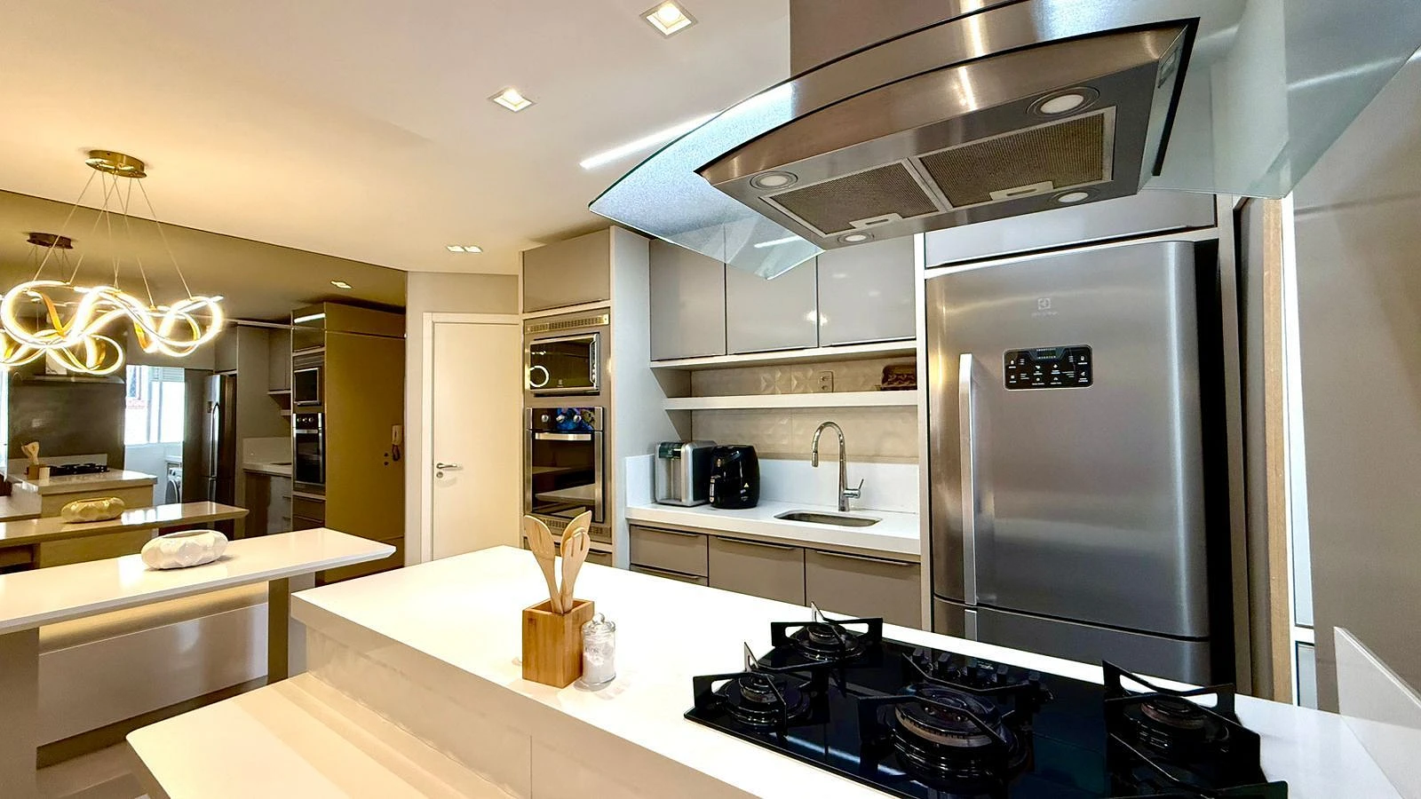 O imóvel é semimobiliado e se destaca pelo design contemporâneo, com cozinha moderna equipada com ilha, integrada aos demais ambientes, proporcionando praticidade e um espaço ideal para receber. Possui ainda sistema automatizado, totalmente integrado com Alexa, trazendo mais comodidade e sofisticação à rotina.