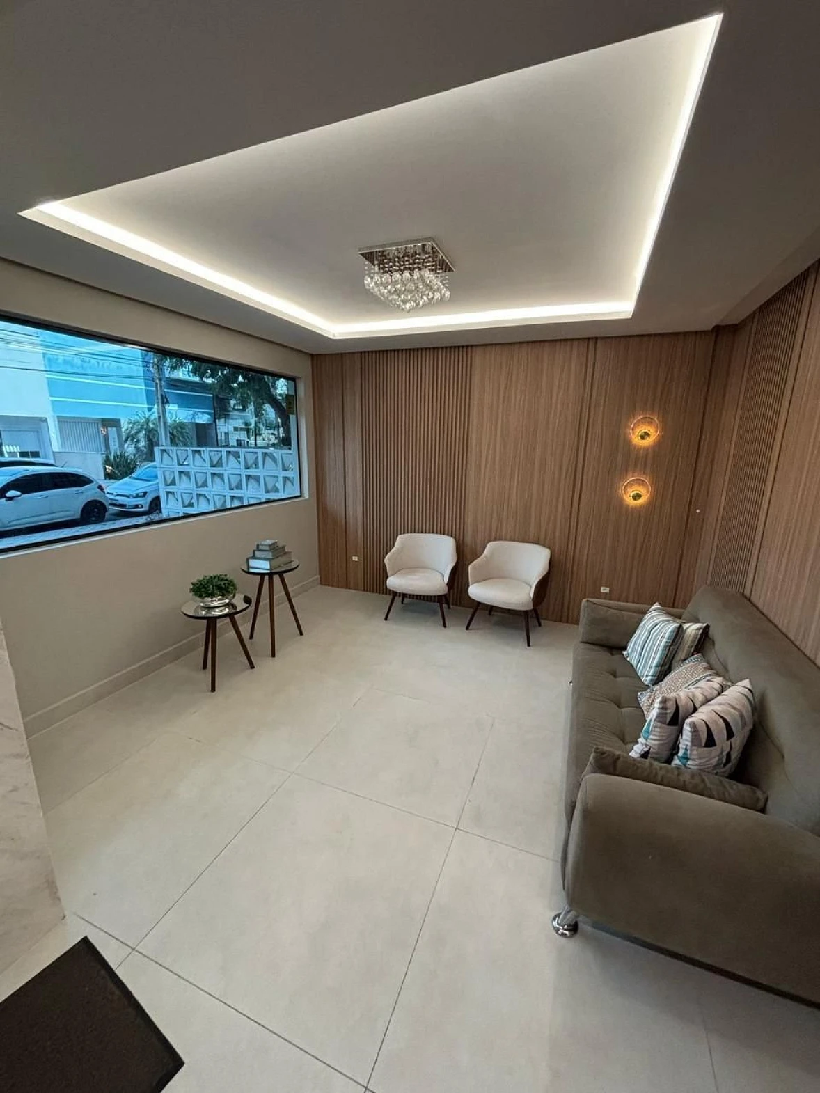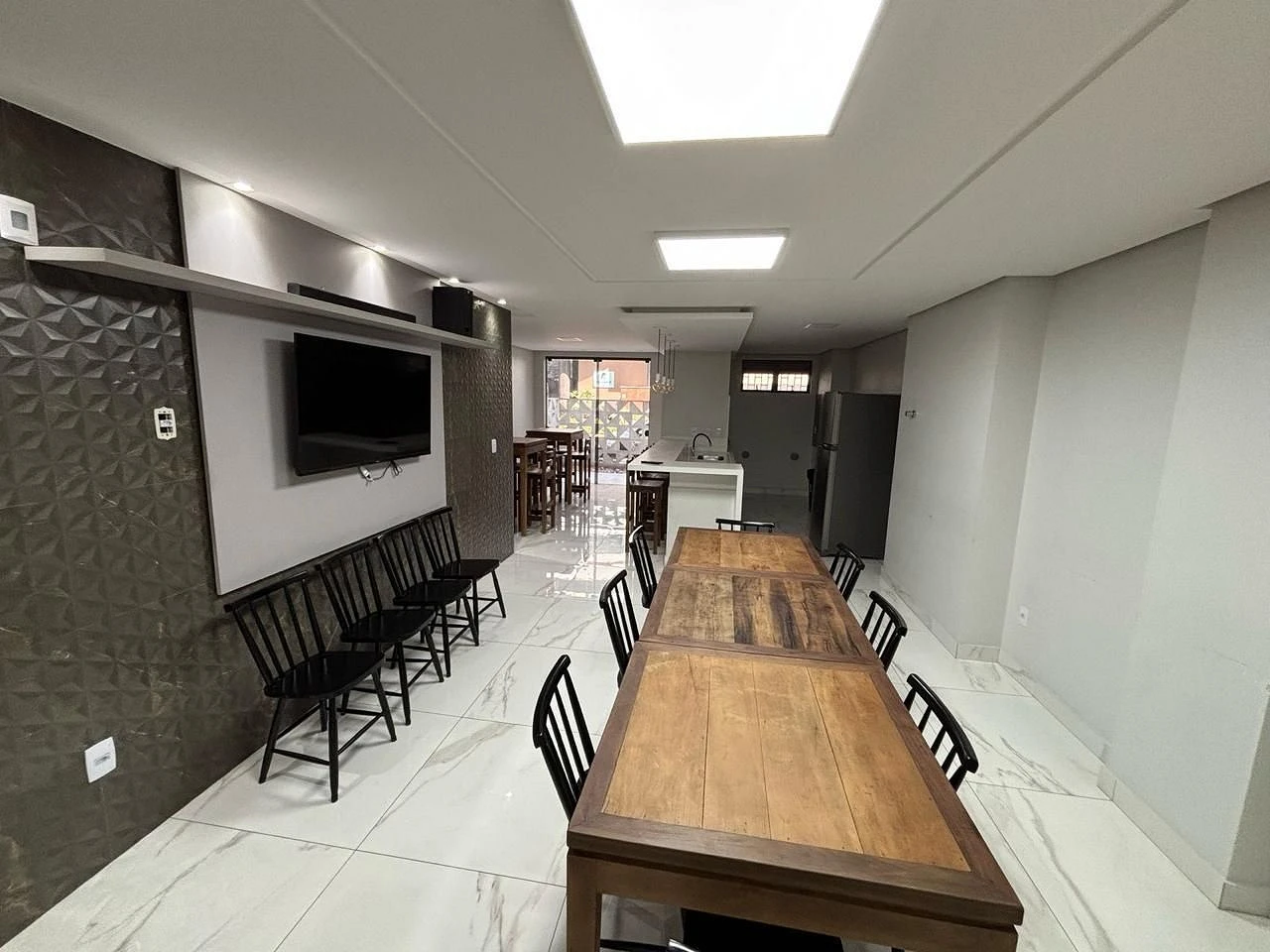 A área social conta com sala de estar e jantar integradas, proporcionando um ambiente aconchegante e contínuo, com piso em porcelanato e iluminação embutida, criando uma atmosfera elegante e acolhedora. A integração com a sacada garante mais luminosidade e ventilação ao espaço.